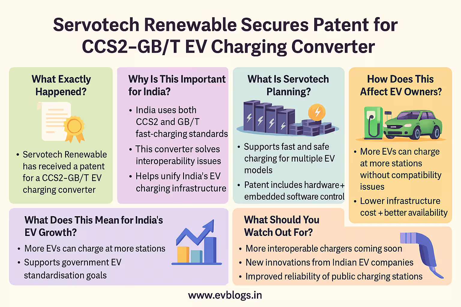 TL;DR: Servotech Renewable has secured a patent for a converter that allows EVs using CCS2 or GB/T charging standards to charge at stations with either connector, potentially easing a major hurdle in India’s EV rollout.